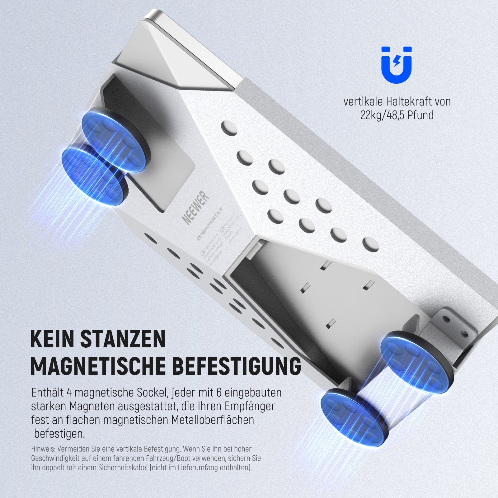 Hinweis: NICHT kompatibel mit dem nach April 2025 veröffentlichten Pipe Mount. - Magnetische Befestigung- Enthält 4 Magnetsockel, von denen jeder mit 6 eingebauten starken Magneten ausgestattet ist, die eine vertikale Haltekraft von 22kg haben und es fest an glatten, magnetisch empfänglichen Metalloberflächen wie Eisendächern von Fahrzeugen/Booten/Gebäuden befestigen. Hinweis: Vermeiden Sie eine vertikale Befestigung. Wenn Sie ihn bei hoher Geschwindigkeit auf einem fahrenden Fahrzeug/Boot verwenden, sichern Sie ihn doppelt mit einem Sicherheitskabel (nicht enthalten)