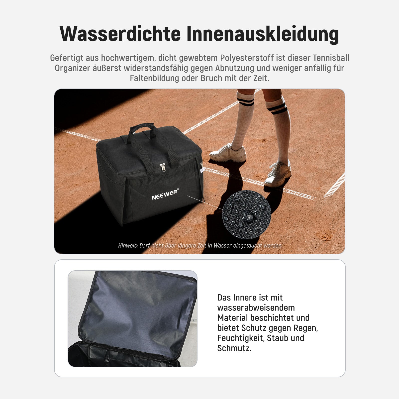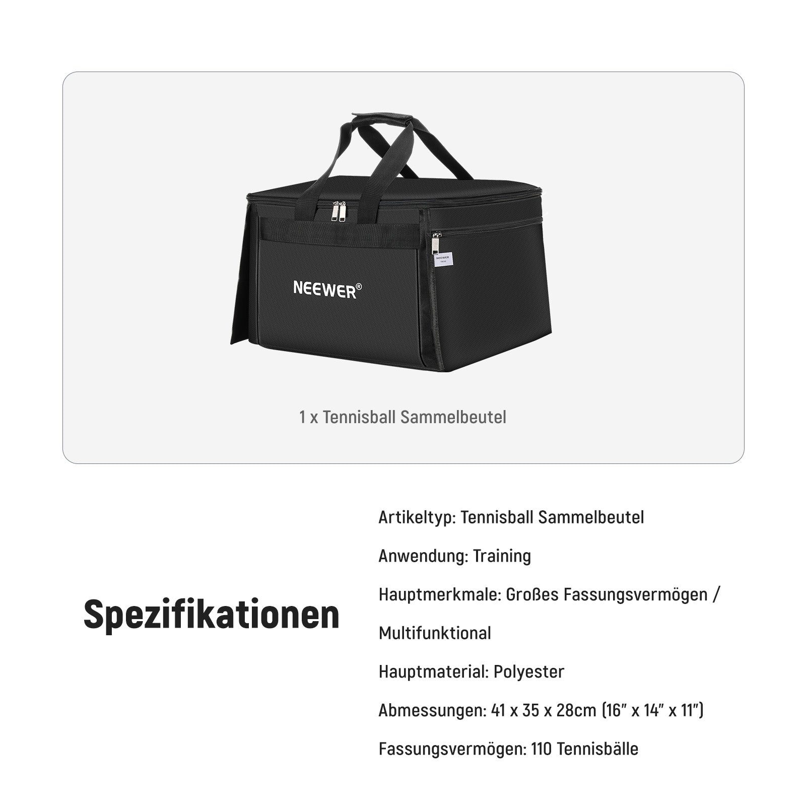- Ausreichend Stauraum- Mit den Maßen 16"x14"x11"/41 x 35 x 28cm bietet der NEEWER Tennisballbehälter ausreichend Platz für zusätzliche Bälle, zusätzlich zum TB01S Ballsammler. Die breite, große Reißverschlussöffnung ermöglicht einen einfachen Zugriff und vereinfacht das Ein und Ausladen der Bälle, um das Training zu verbessern