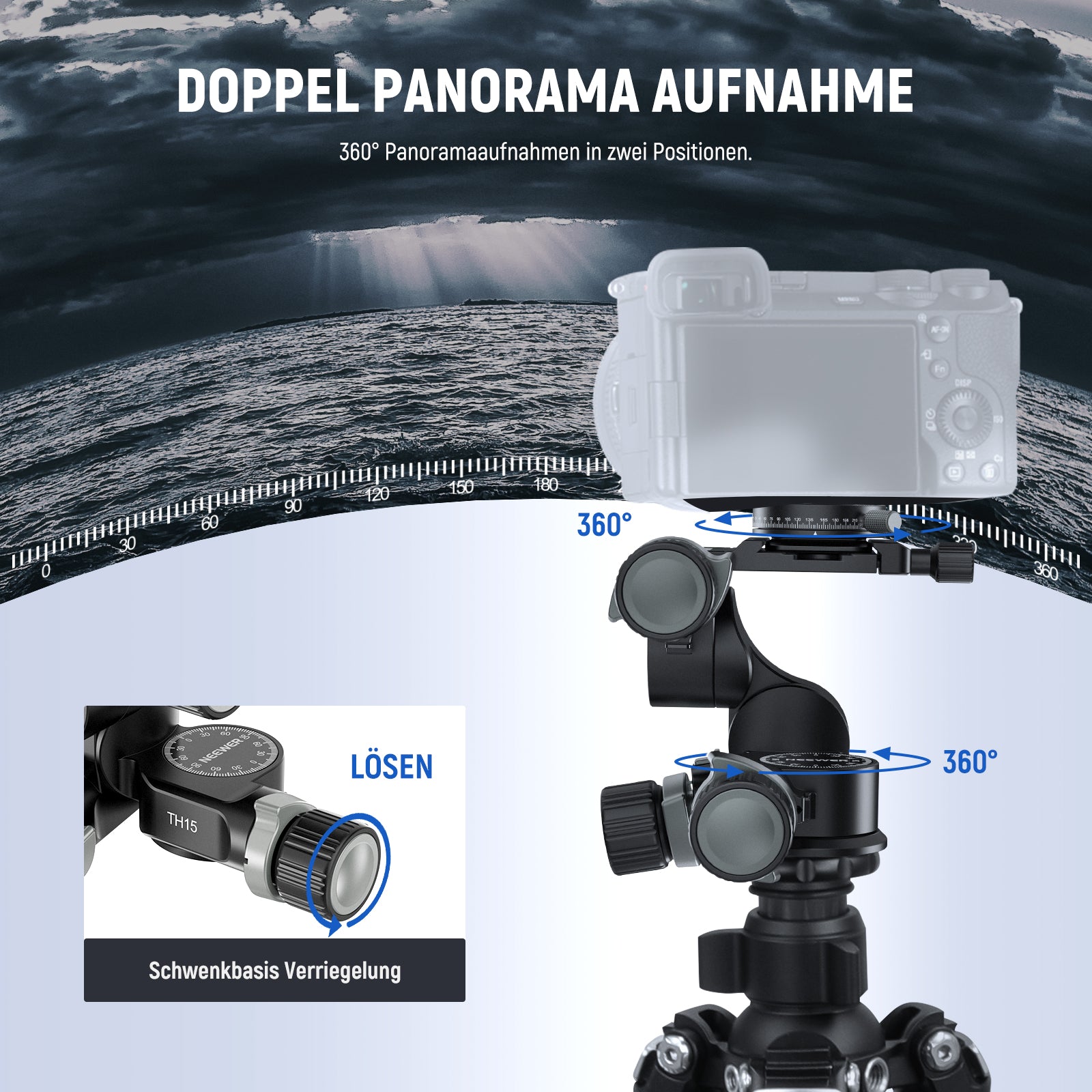 - 360° Panorama Arca Typ QR Platte- Die runde Schnellwechselplatte ist mit standardmäßigen Schwalbenschwänzen des Arca Typs ausgestattet und ist mit einer Vielzahl von Stativköpfen und Fluidköpfen kompatibel, so dass Sie die Kamera auf anderen Geräten verwenden können, ohne die Platte auszutauschen. Sie verfügt außerdem über eine horizontale 360° Drehskala für Panoramaaufnahmen, die mit einem seitlichen Knopf sicher arretiert werden kann