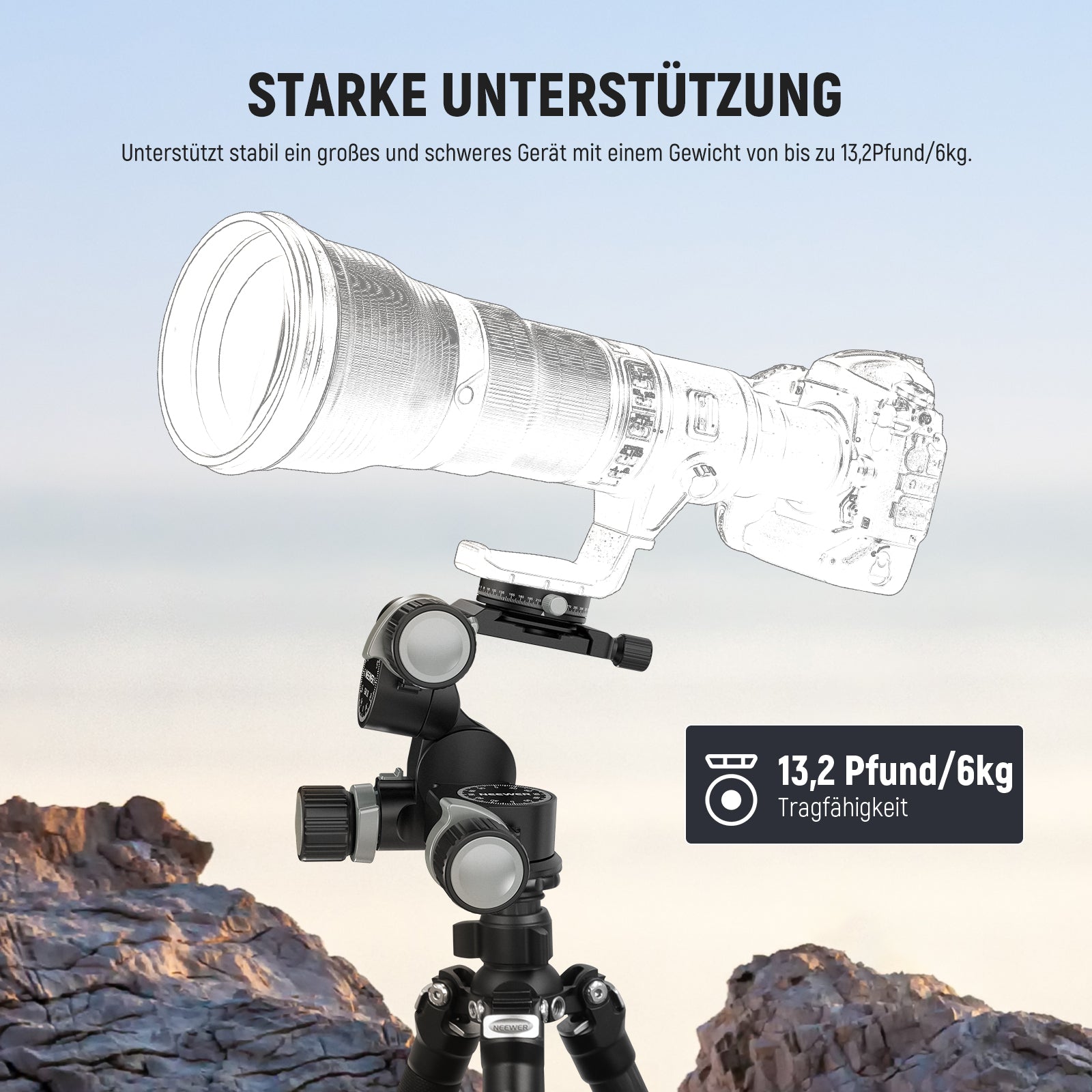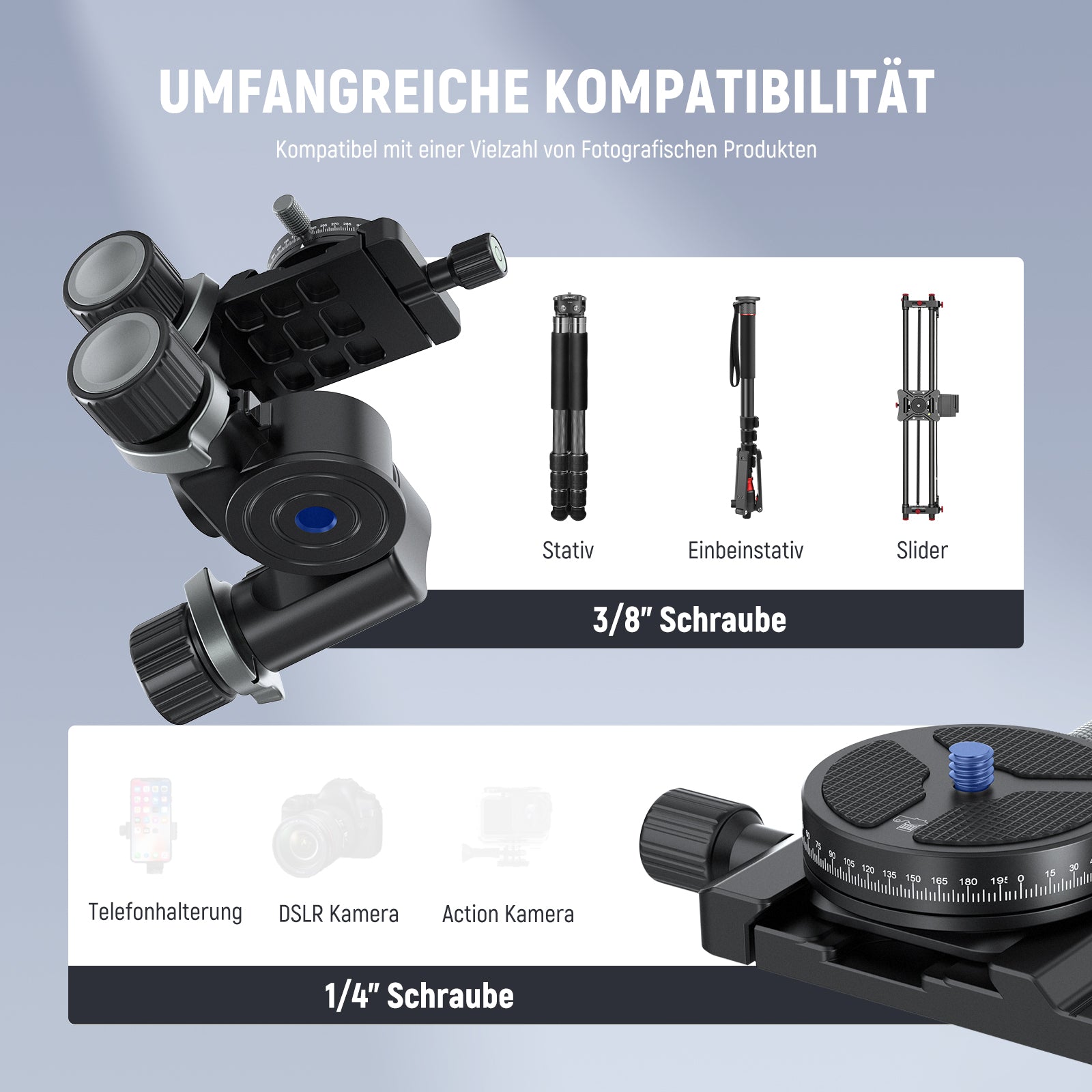 - 1/4" Schraube & 3/8“ Stativsockel- Die 1/4" Schraube kann eine DSLR Kamera, spiegellose Kamera, Kinokamera und Camcorder bis zu 13,2lb/6kg mit Gummipuffern zur Vermeidung von Kratzern befestigen. Und die 3/8“ Stativbuchse verbindet den Kopf mit Stativen, Einbeinstativen, Schiebern und Kamerawagen für stabile Bildaufnahmen und Videoaufnahmen