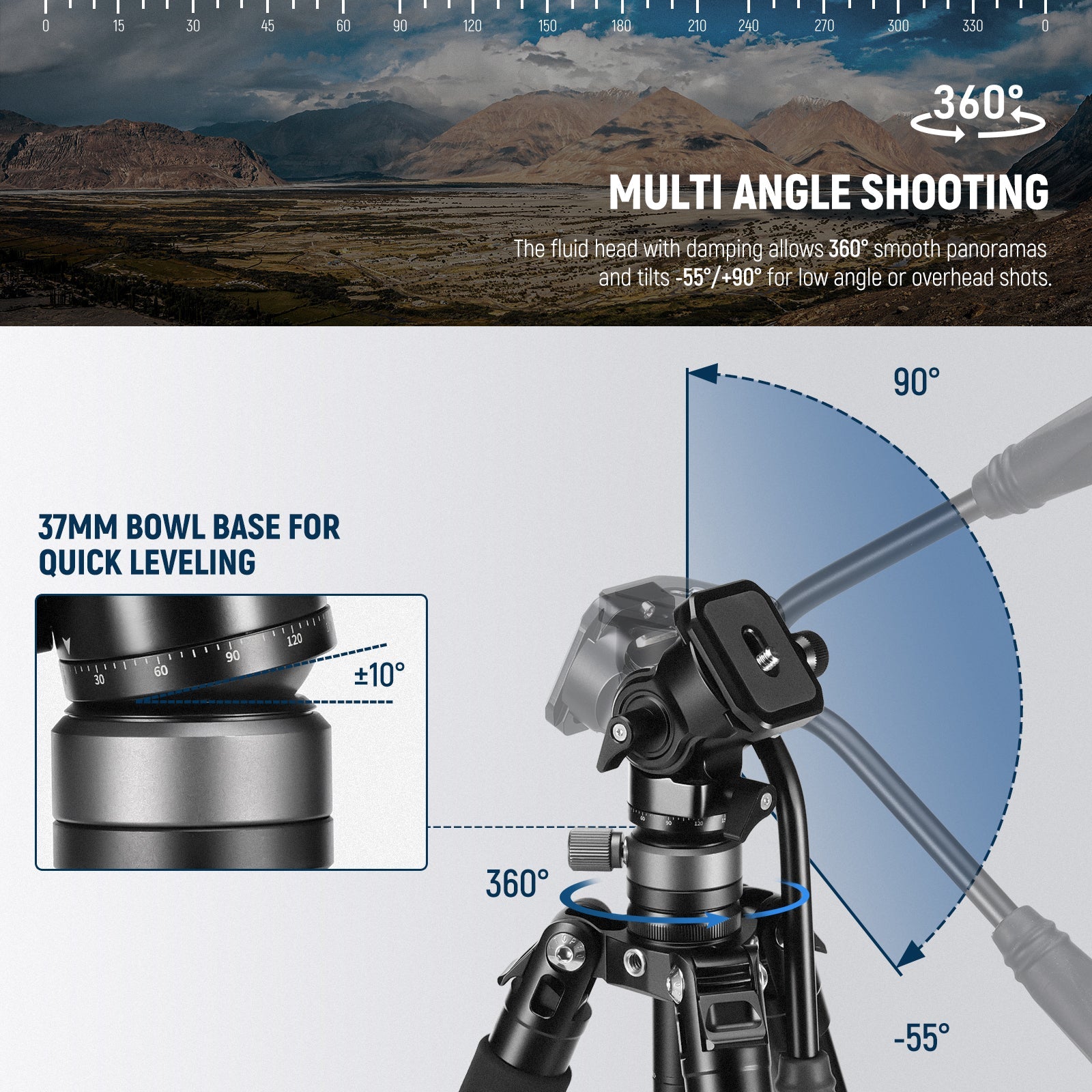 - 【Vielseitiger Fluidkopf für Aufnahmen aus mehreren Winkeln】 Der Fluidkopf mit Dämpfung ermöglicht das sanfte Drehen der Kamera auf der um 360° skalierten Schwenkbasis oder das Neigen um -55°/+90° für Aufnahmen aus niedrigen Winkeln oder über Kopf. Mit der 1/4" Arca Typ Schnellwechselplatte können verschiedene Kameras und Camcorder montiert werden oder Sie können schnell zwischen Hand- und Stativaufnahmen wechseln. Der Griff kann für die Verwendung durch Links oder Rechtshänder abgenommen werden