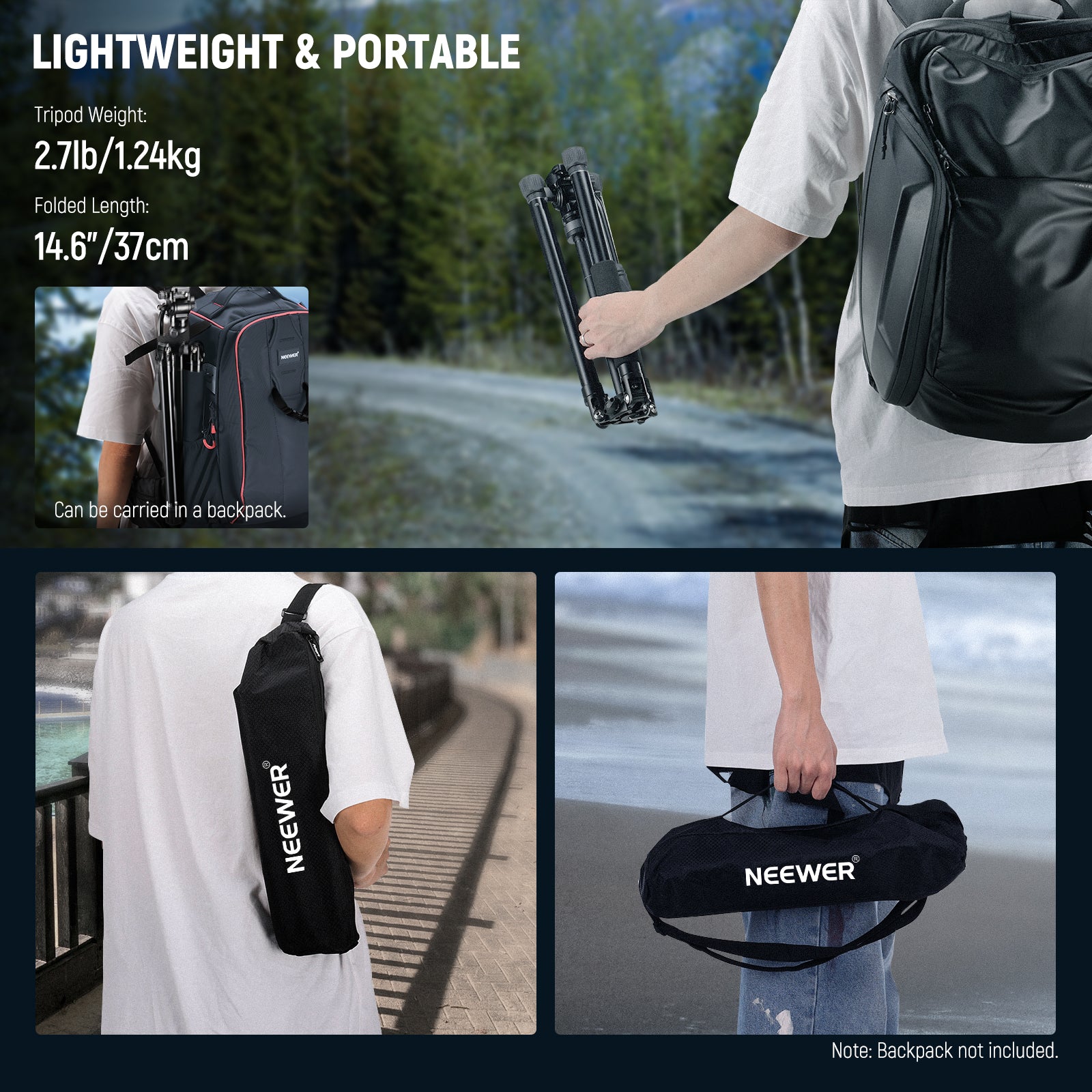 - 【Leichtes, reisefreundliches Stativ】 NEEWER TP61 ist ein leichtes und dennoch robustes Stativ aus Aluminiumlegierung für Reise Vlogging, Fotografie, YouTube Videos und Live Streaming im Innen- und Außenbereich. Mit einem Gewicht von nur 1,24kg und einem maximalen Beindurchmesser von 25mm trägt es bis zu 22lb/10kg (8,8lb/4kg für den Stativkopf). Es lässt sich flach auf 14,6" (37cm) zusammenfalten und passt zur Aufbewahrung und zum Transport in die Tragetasche