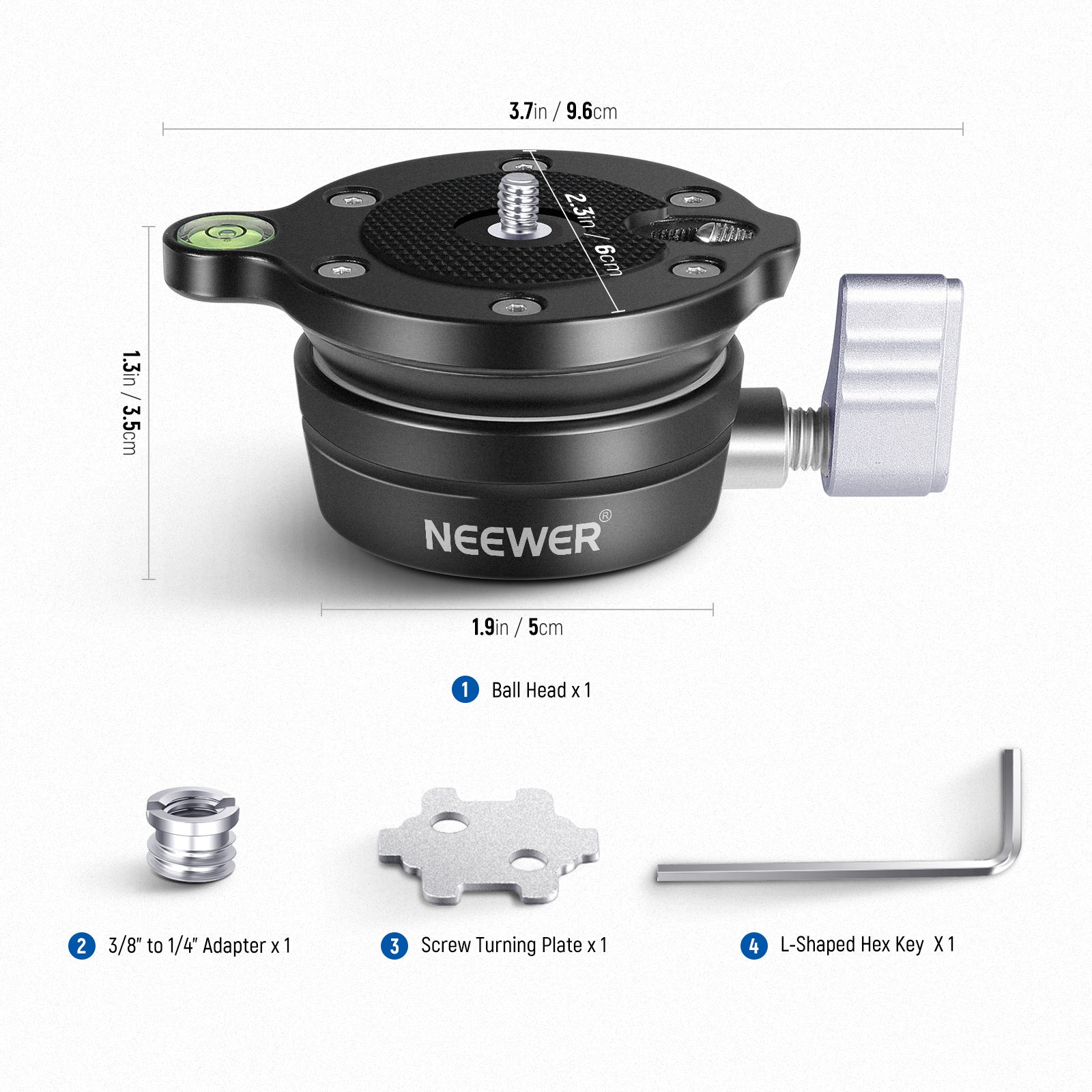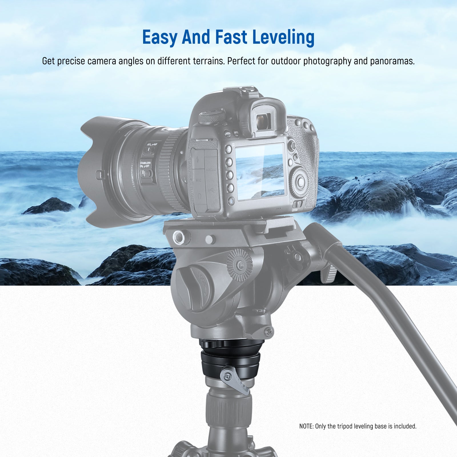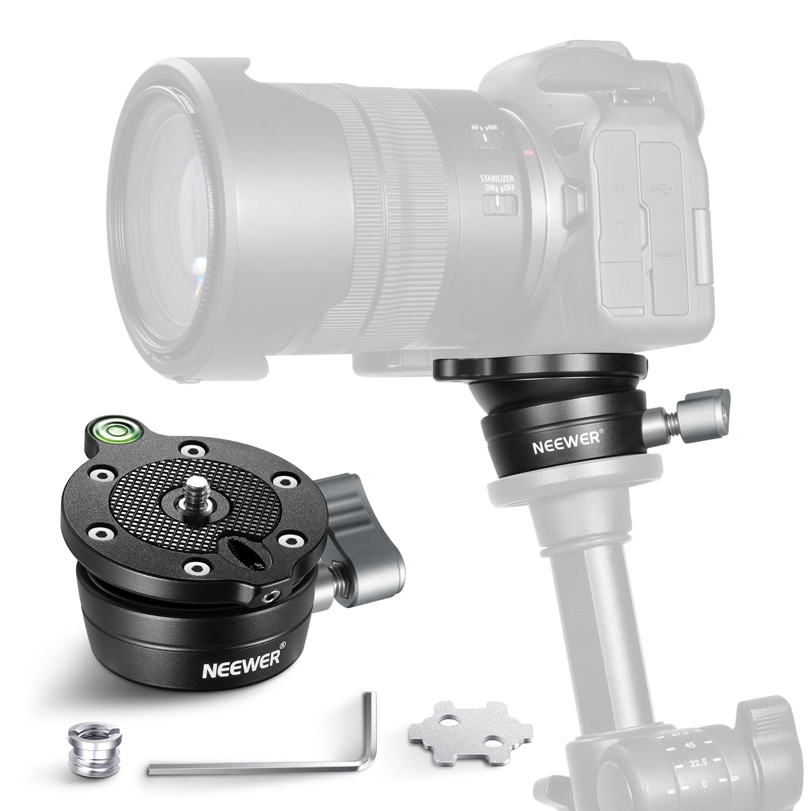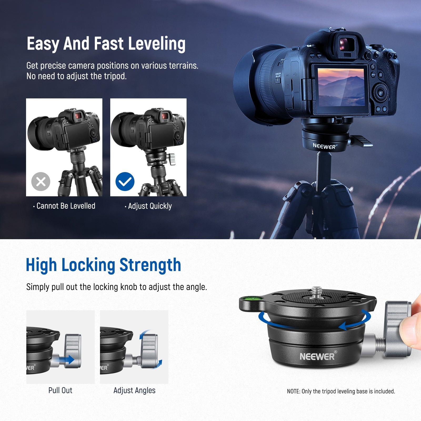 - 【Stativ-Nivellierungsbasis mit 12° Neigung nach oben und unten】Mit einem -12°/+12°-Neigungsdesign, gepaart mit einer 360°-Schwenkbewegung, bietet der NEEWER Stativ-Nivellierungskopf mehr Stabilität und einen flexiblen Aufnahmewinkel, insbesondere für Overhead-Aufnahmen. Ein Verriegelungsknopf sichert die Kamera schnell an Ort und Stelle, und eine Feststellschraube hält die Kamera fest befestig