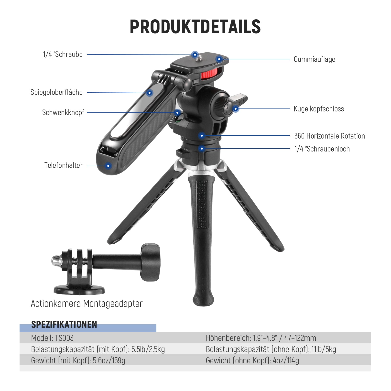 - 【Multifunktionales Mini-Stativ/Griff】 Das NEEWER TS003 Mini-Stativ wurde für Vlogging, Videos und Live-Streaming unterwegs entwickelt und kann eine spiegellose/DSLR-Kamera und einem Mobiltelefon mit bis zu 2,5 kg (5,5 lb) aufnehmen und ist für den Handbetrieb und der Verwendung auf dem Tisch geeignet. Ein abnehmbarer Action-Kamera-Adapter, der mit GoPro Hero 11 10 9 Black kompatibel ist, kann verwendet werden, um immersive POV-Aufnahmen zu machen