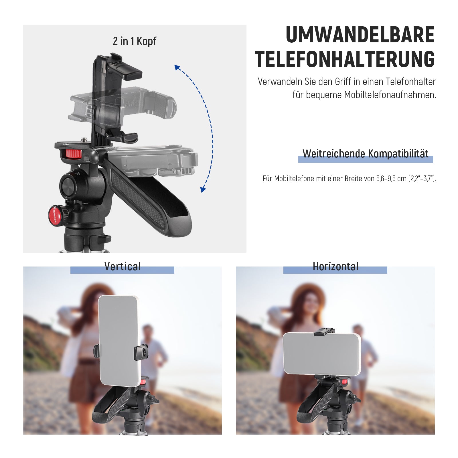 - 【Umwandelbar in einen Telefonhalter】 Der Mini Stativkopf unterstützt das Schwenken oder Neigen mit Geschmeidigkeit und Präzision.Der 2 in 1 Griff kann in einen 2,2"-3,7"(5,6-9,5cm)verstellbaren Telefonhalter umgewandelt werden,der mit iPhone 14 iPhone 14 Pro Max Galaxy S23 Ultra Pixel 7 Pro und anderen Handys für vertikale&horizontale Aufnahmen kompatibel ist. Entwickelt,um mit zwei Geräten gleichzeitig zu fotografieren,das Handy am Griff zu halten und die Kamera auf dem Stativkopf zu montieren