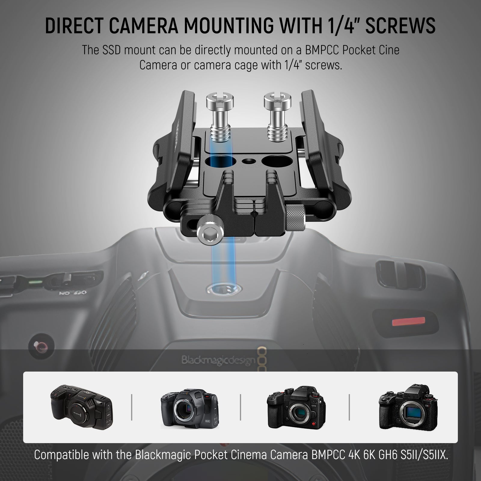 - 【Direkte Kameramontage mit 1/4" Schrauben】Wenn der Cold Shoe Adapter entfernt ist, ist diese SSD Montagehalterung mit der Blackmagic Pocket Cinema Camera BMPCC 4K 6K GH6 S5II/S5IIX und anderen Modellen kompatibel, die über ein 1/4" Gewindeloch an der Oberseite verfügen und die mitgelieferten 1/4" Schrauben verwenden. Es kann auch mit den 1/4" Schrauben sicher am Kamerakäfig befestigt werden