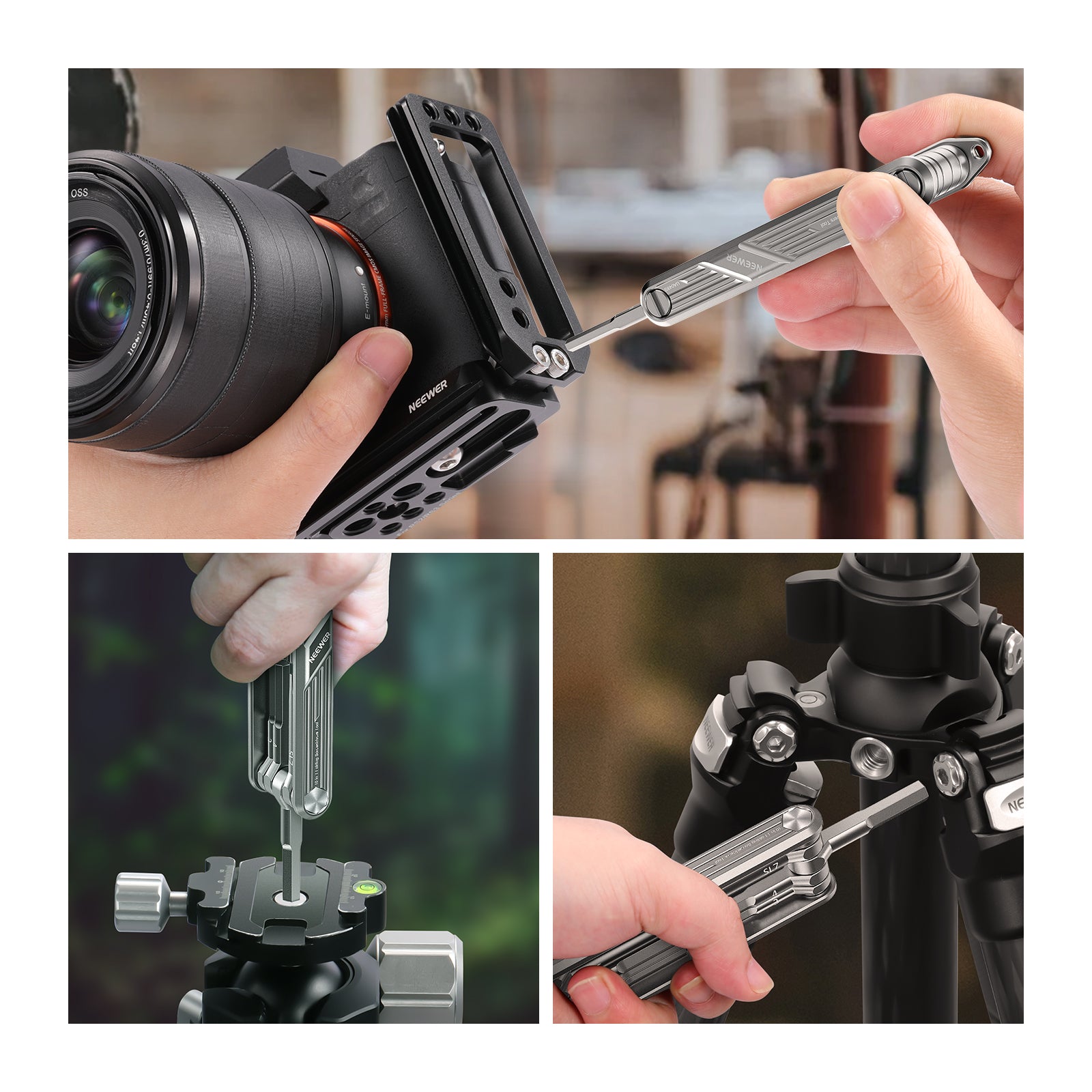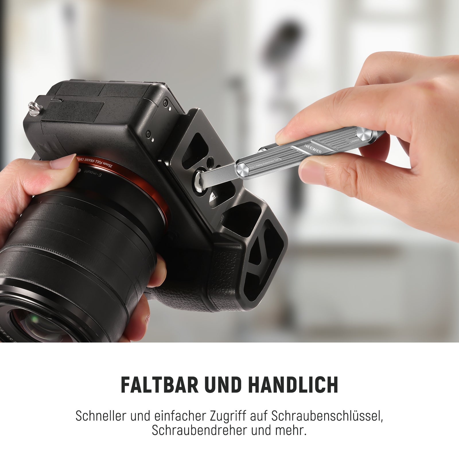 - 【Vielseitiges 10 in 1 Kamerawerkzeugset】 Mit diesem unverzichtbaren 10 in 1 Klappwerkzeugset mit 6 Arten von Innensechskantschlüsseln (2,0, 2,5, 3, 4, 5, 3/16) und 4 Schraubendrehern (Torx T25, Phillips, SL7 und Schlitz) sind Sie immer für kleinere Reparaturen gerüstet. Ideal zum Anziehen und Lösen von Schrauben und zur Durchführung von DIY Reparaturen an Kamerakäfigen, Telefonkäfigen, oberen Griffen, seitlichen Griffen, Stativköpfen oder Schnellwechselplatten
