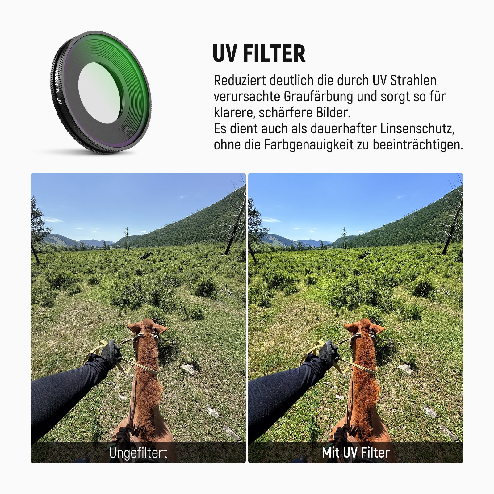 - Minimiert Dunst und UV Strahlen- Der UV Filter kann Dunst effektiv beseitigen und UV Strahlen blockieren, um das Kameraobjektiv zu schützen. Er fungiert auch als permanenter Objektivschutz, ohne die Farbgenauigkeit zu beeinträchtigen