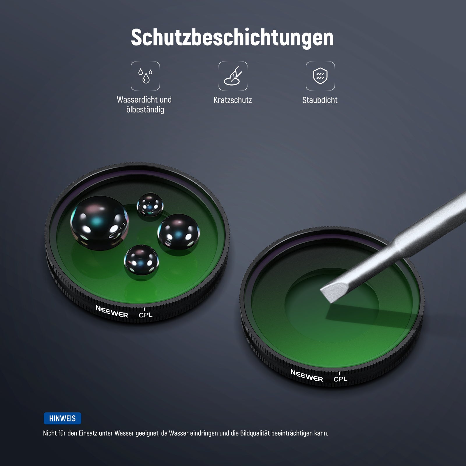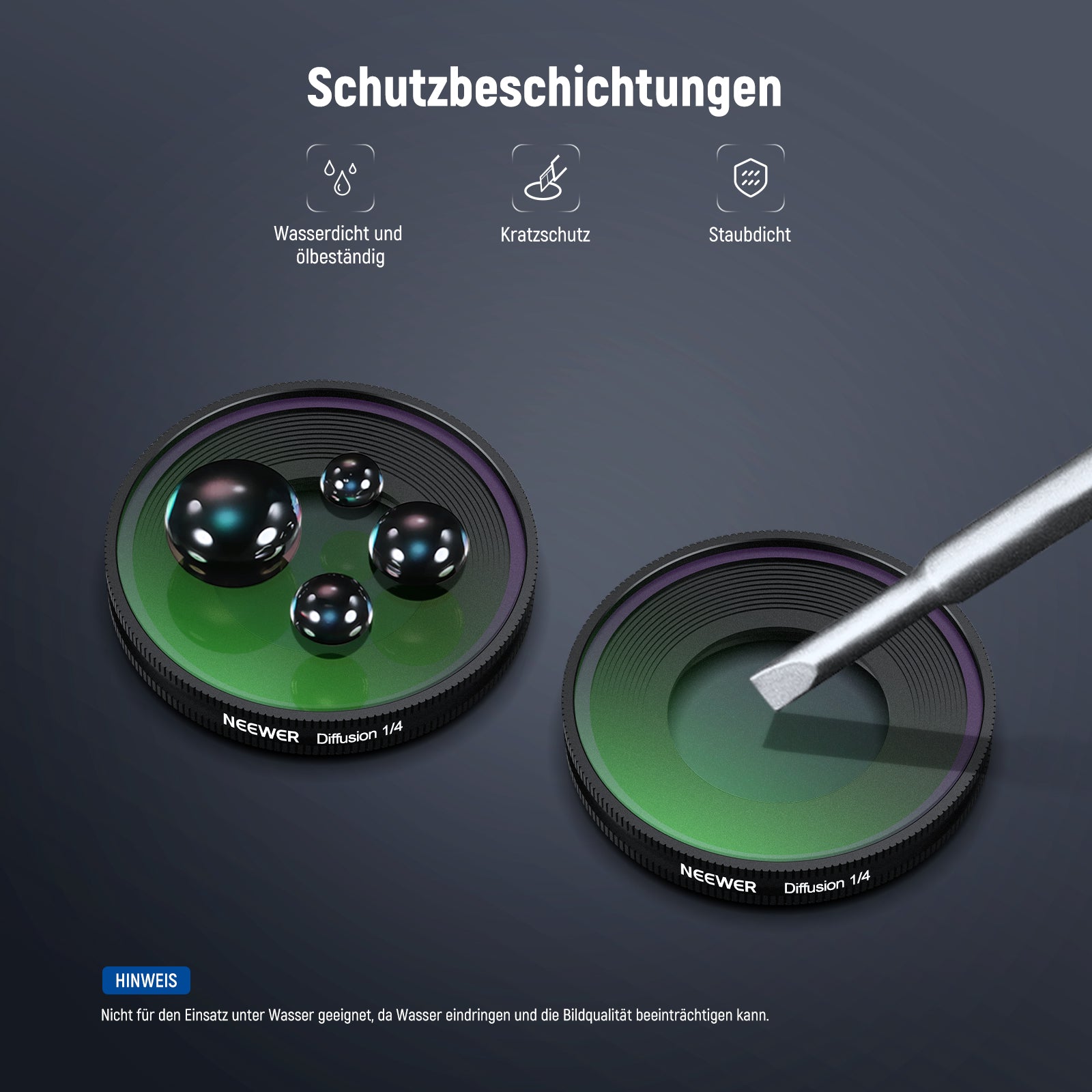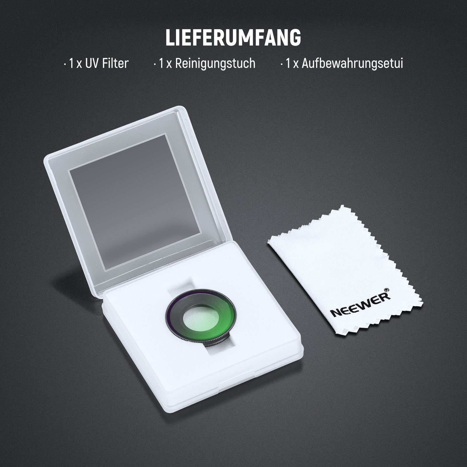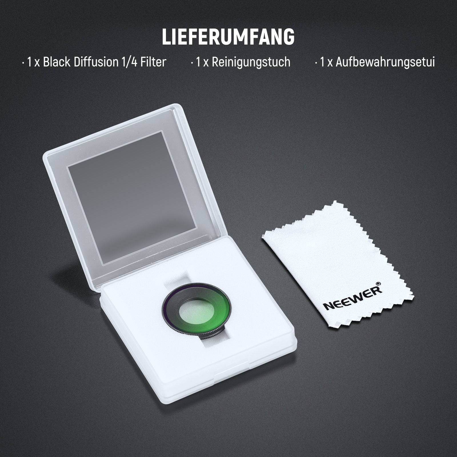 - Filtertypen: UV / CPL / 1/4 Black Diffusion