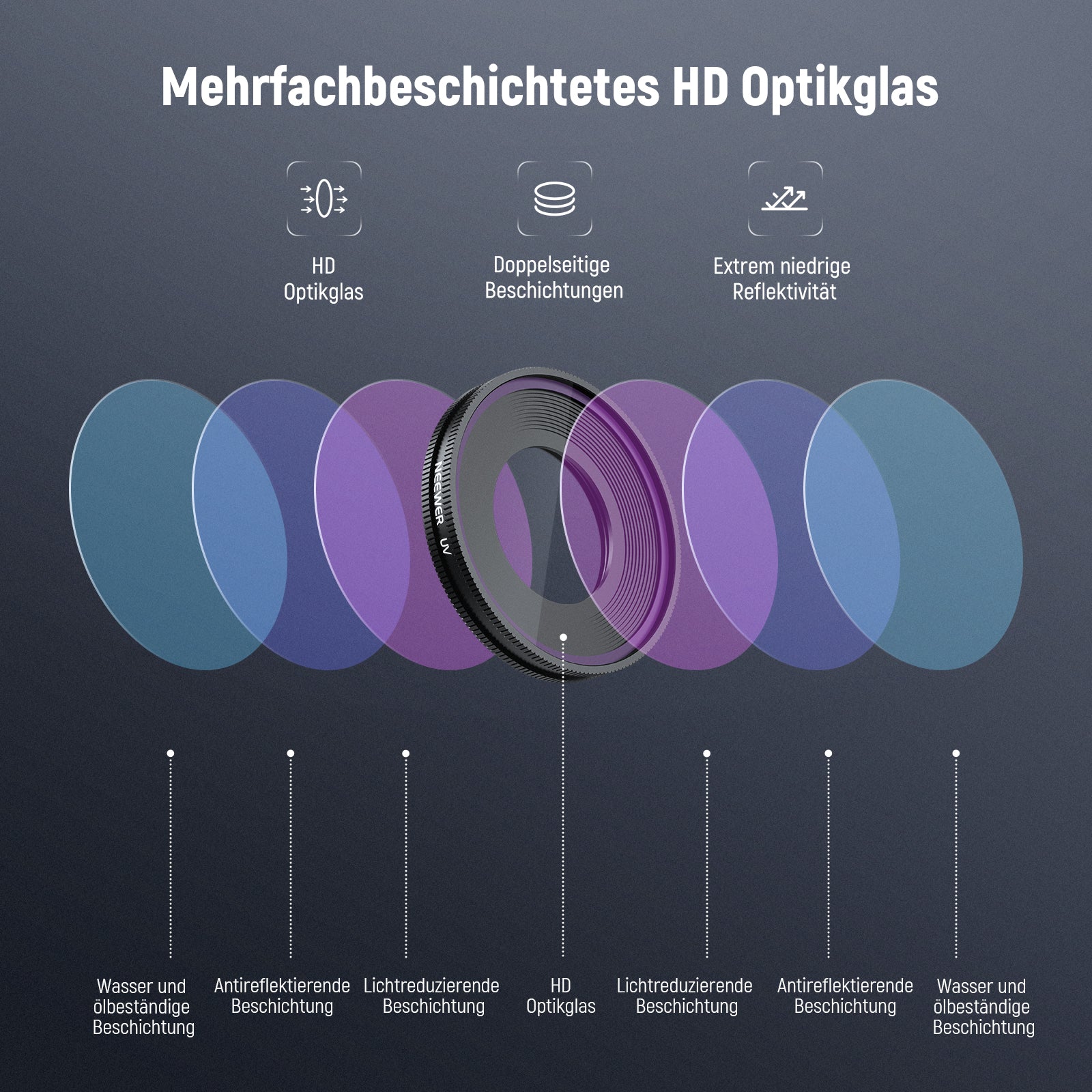 - Mehrfachvergütetes optisches Glas- Sorgt für scharfe Bilder und ist beständig gegen Wasser, Fingerabdrücke und Kratzer im täglichen Gebrauch. Ein Reinigungstuch für die Pflege ist im Lieferumfang enthalten
