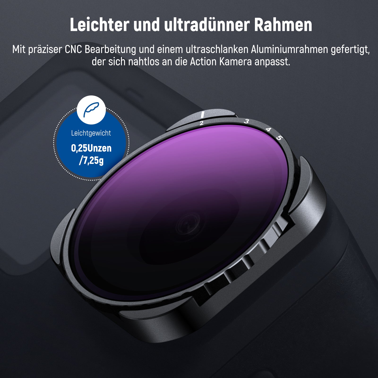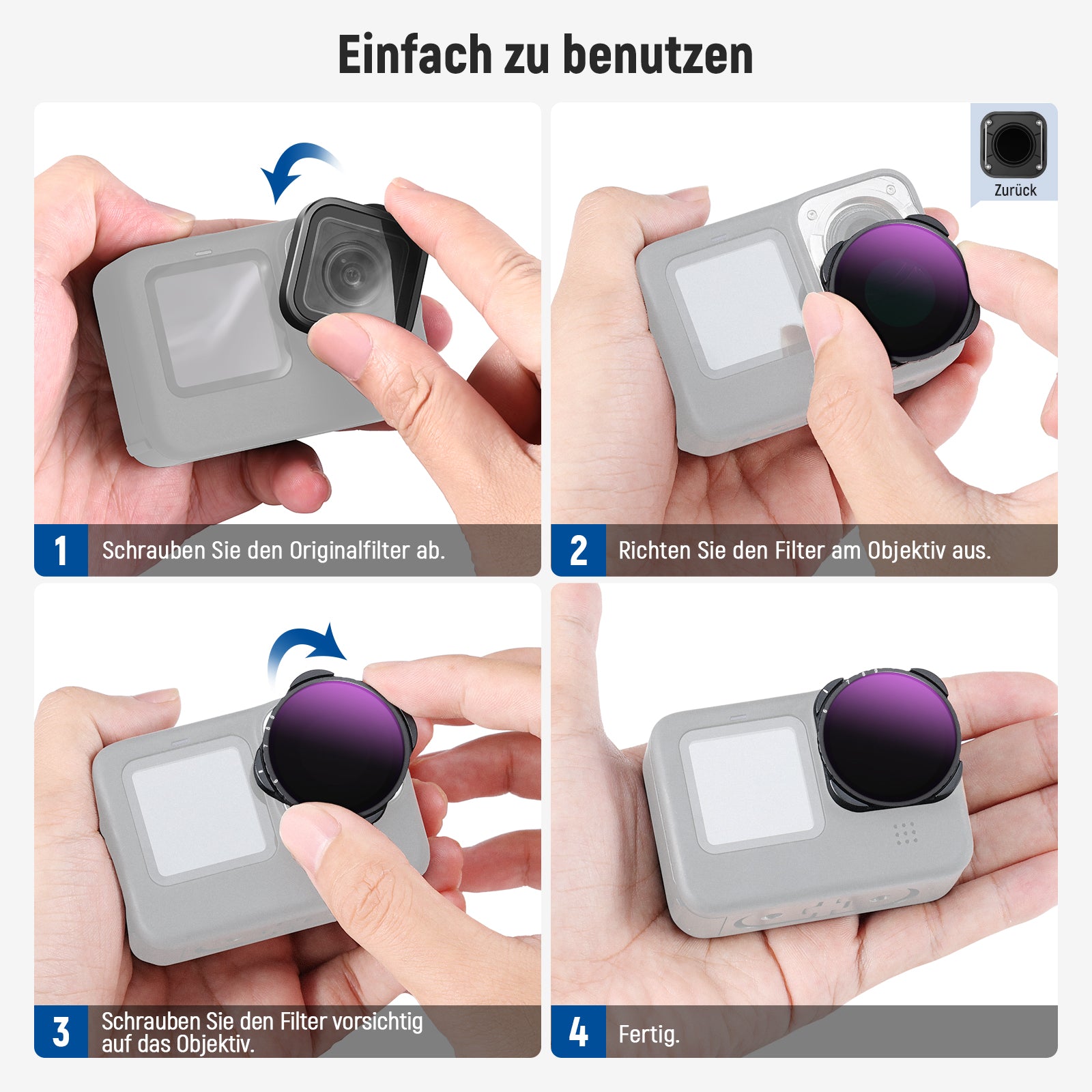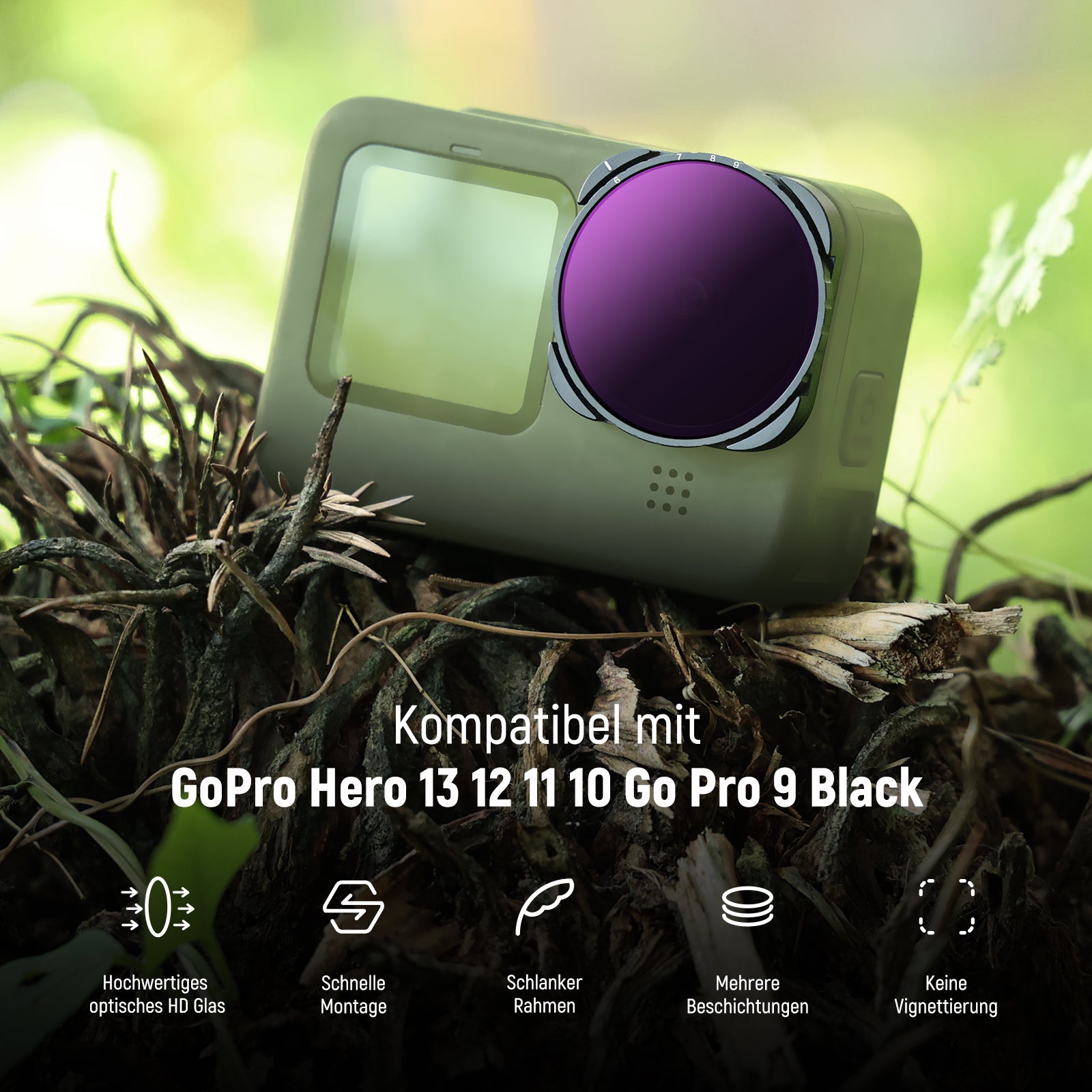 - Kompatibel mit GoPro 9 10 11 12 13- Dieses Zubehörset für Actionkameras mit variablem ND Filter ist kompatibel mit GoPro 7 8 9 10 11 12 13 Hero 12 Creator Edition. Es hilft Ihnen, verschiedene Lichtverhältnisse im Freien problemlos zu bewältigen, von bewölkt bis hin zu hellen, sonnigen Tagen, und die Lichtmenge zu steuern, die in Ihr Kameraobjektiv eindringt, um eine Überbelichtung zu vermeiden