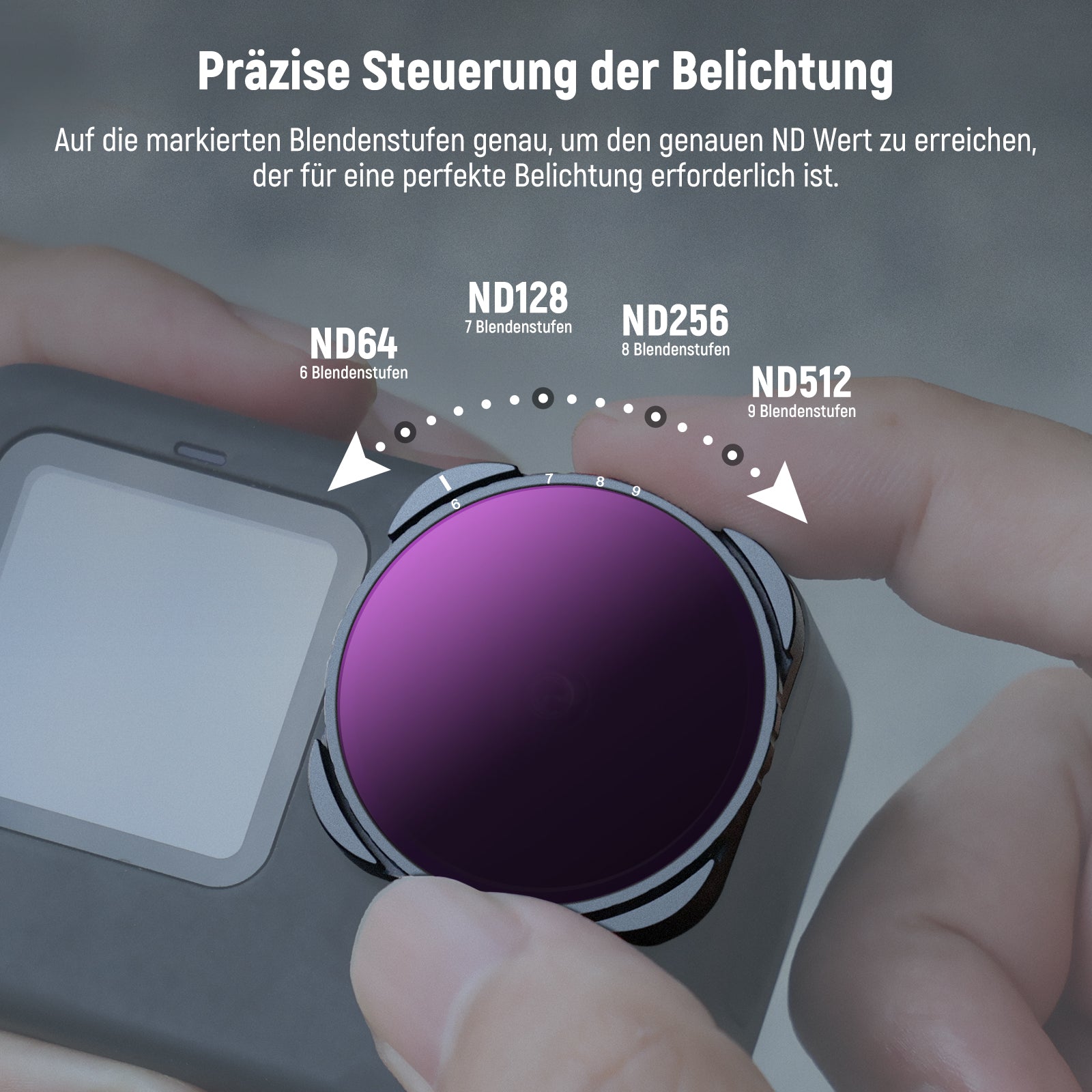 - Variable und präzise Lichtsteuerung- Harte Stops an beiden Enden begrenzen die Neutraldichte zwischen ND4 und ND32 (2 und 5 Stops) oder ND64 und ND512 (6 und 9 Stops). Drehen Sie einfach den Objektivfilter der Action Kamera bis zum genau markierten Stop, um die gewünschten Lichtreduzierungsstufen für eine präzise Belichtungssteuerung zu erreichen und bewegte Motive mit ausdrucksstarken Bewegungsunschärfeeffekten aufzunehmen